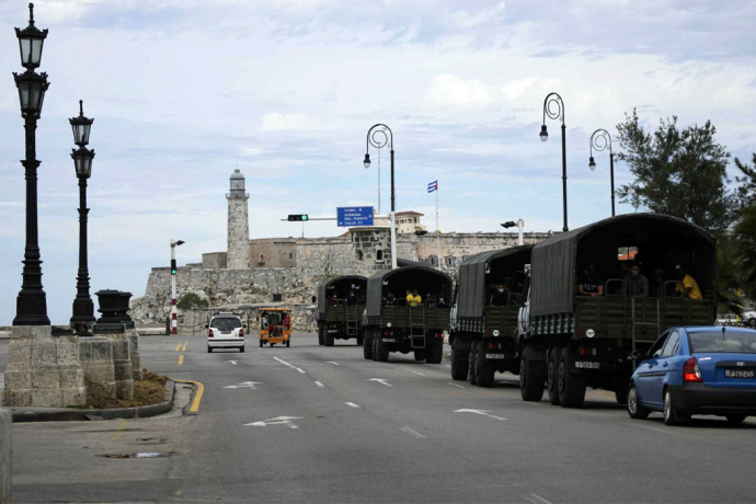 Camiones militares patrullan a lo largo del malecón en La Habana, Cuba, el lunes 15 de noviembre de 2021. El gobierno prohibió una marcha de oposición en la jornada. (Foto AP/ Ramón Espinosa)