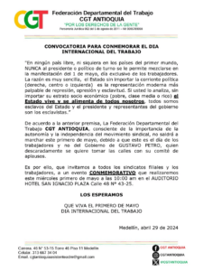 (K Lancheros-Infoabe) – La Confederación General del Trabajo (CGT) de Antioquia tomó una posición con relación a las movilizaciones del Día del Trabajo, el 1 de mayo. En un comunicado, la central sindicalista anunció su decisión de no participar en las marchas programadas para conmemorar esta fecha, ante el desacuerdo que tiene con la participación del presidente Gustavo Petro en las mismas.