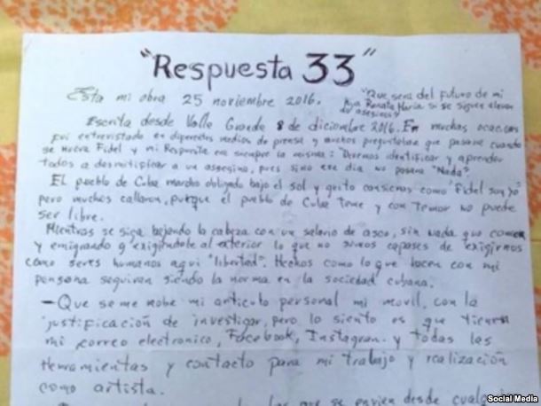 En el manuscrito titulado “Respuesta 33″ y publicado en Facebook por su novia residente en Miami, Alexandra Martínez, Maldonado alude al asalto encabezado por Castro al Cuartel Moncada de Santiago de Cuba en 1953: “Tengo la edad de Cristo cuando fue apedreado y crucificado por el pueblo que llenó de sabiduría. Yo no he asaltado ningún cuartel. Tampoco tenía empuñado un fusil. Yo tengo pluma, papel y spray”.