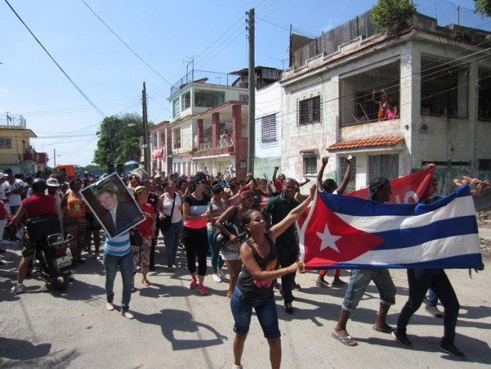 Devastados por la sed, el calor y la espera, los enfrentadores y enfrentadoras apenas hablan. Se murmura incluso que se trata de otro día perdido, que “las gusanas empiezan a entender la fuerza invicta de la Revolución”, que “son auras asustadas a las que hay que asfixiar de una vez por todas”, “ratas a las que no se puede perder de vista porque aprovechan a lanzar la mordida y vomitar su veneno contrarrevolucionario”. De pronto todo se agita. Voces de alarma, “estén listo, ya vamos a salir”. Despliegan pancartas y banderas hasta ahora ocultas. Enardecida va la caravana calle arriba. Seis niños van sobre los hombros de sus padres. “Para que empiecen a defender desde temprano la Revolución de esa plaga blancusa”, dice un hombre calvo, corpulento, de gafas negra. Son exactamente las 4:00 pm.