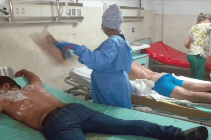 Otra clara evidencia de cuáles son las verdaderas prioridades del régimen la presenta una imagen que se ha vuelto viral en las redes sociales: enfermeras en el hospital abanicando con un trozo de cartón las espaldas quemadas de sus pacientes, en una deteriorada sala de atención. La foto fue publicada en la cuenta de Twitter del Ministro de Salud pública, José Angel Portal Miranda, bajo el mensaje “El Sistema Nacional de Salud tiene total disponibilidad de recursos humanos y materiales para enfrentar la emergencia”.