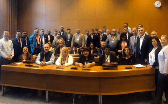 Emilio Gottardi, miembro ejecutivo de la ASIC, se dirige a otros miembros de la ADS durante la 108ª CIT, durante la reunión anual de la ADS durante la 108ª Conferencia Internacional del Trabajo. Ginebra, Suiza 13 de junio 2019.