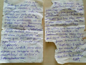 La carta, compartida por Mileydi Machín, madre de Medina, está redactada a mano y con evidente precariedad material. En el texto, el joven relata un hostigamiento constante, que describe como “tortura psicológica” y cuenta cómo en los interrogatorios se le ha insistido para que haga un video con las palabras “arrepentimiento” y “retractación”, que él rechaza rotundamente.
