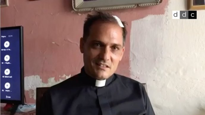 “El domingo no pude llegar a mi casa. Me dirigí hacia donde estaban los manifestantes buscando acompañarlos. Los acompañé todo lo que pude caminar y traté de evitar que hubiera confrontación, violencia, pero al final, intentando evitar una violencia hacia alguien, he recibido yo un golpe con un bate”, explicó el sacerdote, con una herida en la cabeza.