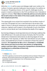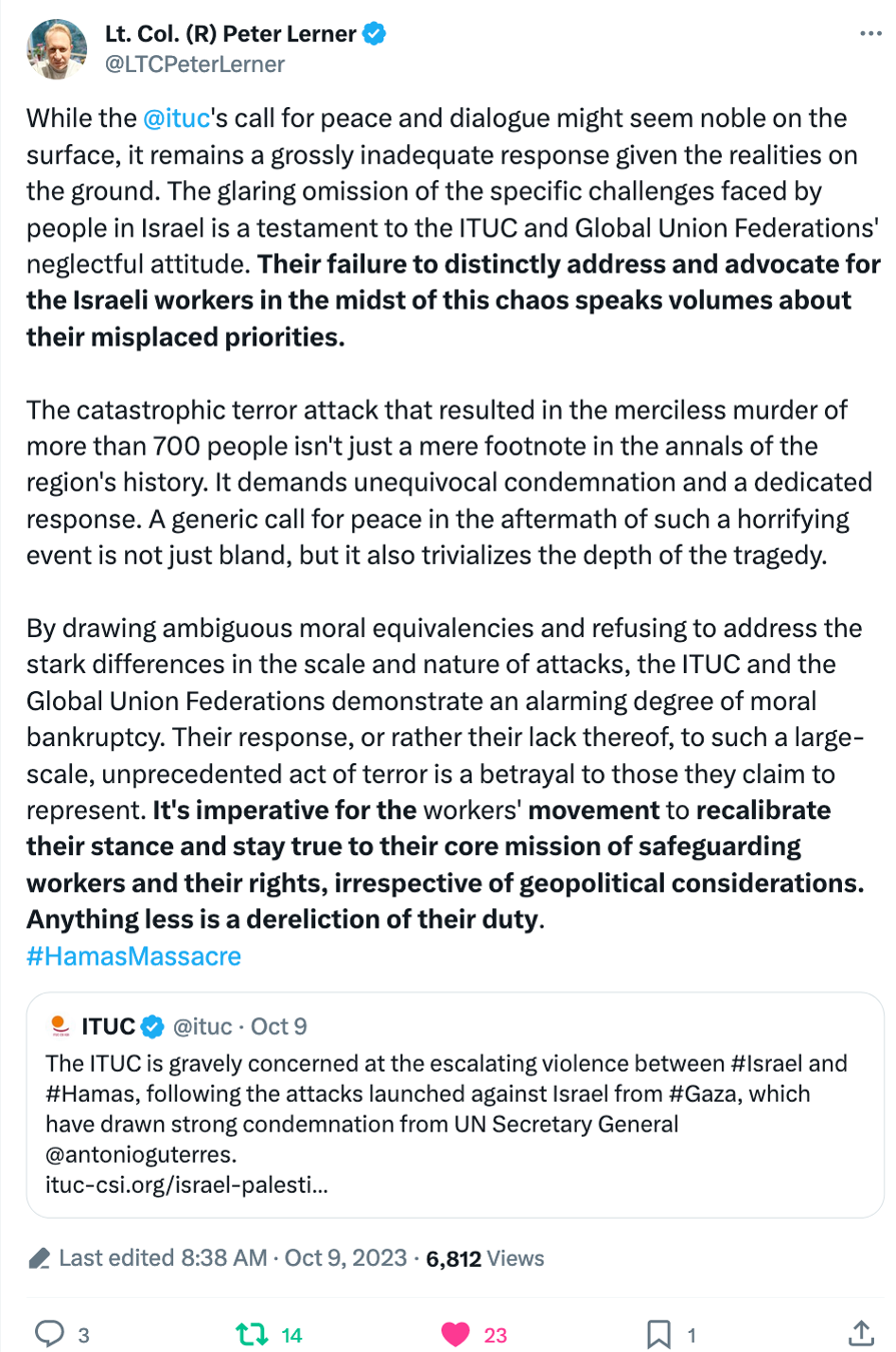 “Al establecer ambiguas equivalencias morales y negarse a abordar las marcadas diferencias en la escala y la naturaleza de los ataques, la CSI y las Federaciones Sindicales Internacionales demuestran un alarmante grado de bancarrota moral. Su respuesta, o más bien su falta de respuesta, a un acto de terror a tan gran escala y sin precedentes es una traición a aquellos a quienes dicen representar. Es imperativo que el movimiento obrero recalibre su postura y se mantenga fiel a su misión fundamental de salvaguardar a los trabajadores y sus derechos, independientemente de consideraciones geopolíticas. Todo lo que no sea eso es faltar a su deber.” (Traducción al español por Cuba Sindical).