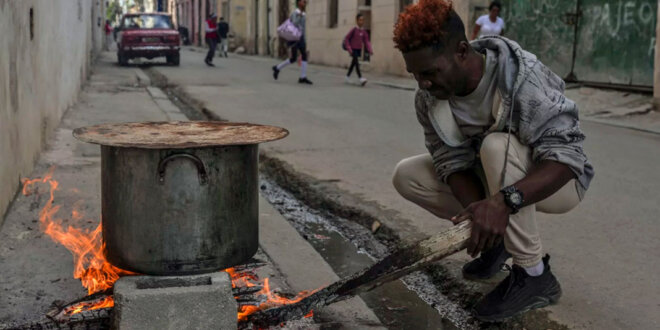 Un hombre cocina sopa sobre un fuego abierto en una acera, durante un apagón en La Habana, Cuba. (Espinosa/AP)
