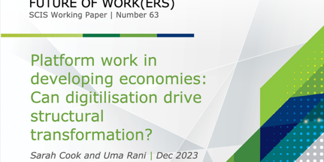 El documento de Sarah Cook y Uma Rani, titulado Platform work in developing economies: Can digitalization drive structural transformation? , se centra principalmente en el trabajo realizado a través de plataformas laborales digitales, como mensajeros de reparto, conductores y cuidadores, y en las tareas realizadas en plataformas basadas en Internet, incluidos servicios profesionales como la programación de software.